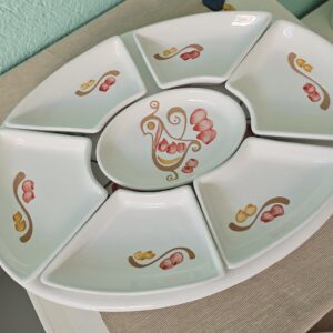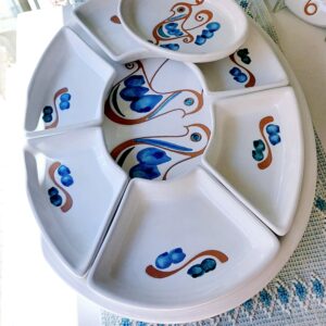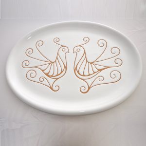 Antipastiera ovale in ceramica decorata a mano, la decorazione del piatto riproduce le pavoncelle tradizionali realizzate con l’antica tecnica del graffito su smalto bianco che mette in risalto le sfumature aranciate dell’argilla. Composta da 8 pezzi.