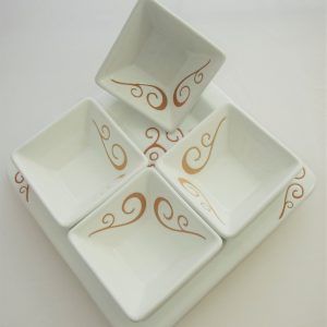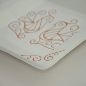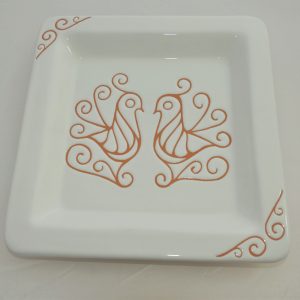 Antipastiera quadrata composto da vassoio e quattro vaschette in ceramica decorata a mano, la decorazione riproduce una coppia di pavoncelle tradizionali realizzate con l’antica tecnica del graffito su smalto bianco che mette in risalto le sfumature aranciate dell’argilla.