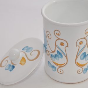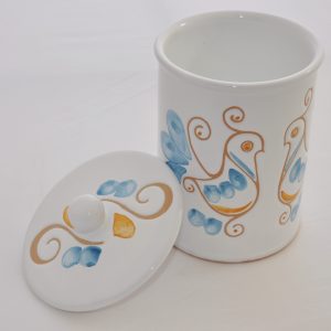 Barattolo in ceramica decorato a mano, la decorazione riproduce una coppia di pavoncelle tradizionali realizzate con l’antica tecnica del graffito su smalto bianco che mette in risalto le sfumature aranciate dell’argilla arrichito dai tocchi delle pennellate di azzurro oltrremare e giallo brillante.