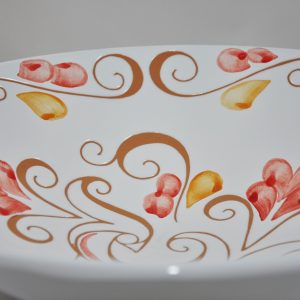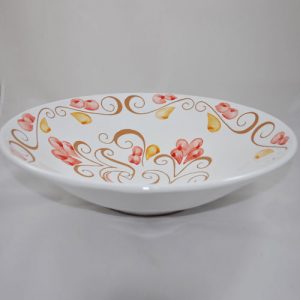 Ciotola Coppa in ceramica decorata a mano,caratterizzata dalla decorazione che riproduce una pavoncella stilizzata, realizzata con l’antica tecnica del graffito su smalto bianco che mette in risalto le sfumature aranciate dell’argilla. Il rosso corallo e gli aranci brillanti sono ottenuti aggiungendo al graffito tocchi di pennello.
