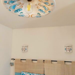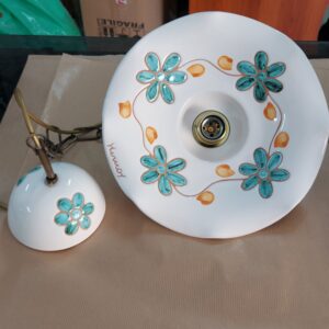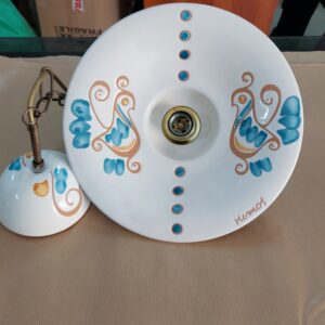 Lampadario in ceramica decorato a mano, la decorazione riproduce la pavoncella stilizzata realizzata con l’anticatecnica del graffito su smalto bianco che mette in risalto le sfumature aranciate dell’argilla.