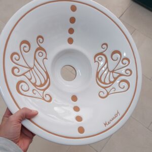 - La terza fase consiste nel togliere il pezzo dal forno che si sarà trasformato da semplice argilla in “biscotto” con una colorazione rossiccia. A questo punto il pezzo viene smaltato di bianco e lasciato asciugare per poi poter essere inciso e colorato.