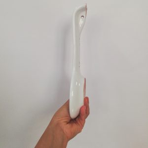 Poggiamestolo in ceramica decorato a mano. La decorazione riproduce una coppia di pavoncelle tradizionali realizzate con l’antica tecnica del graffito su smalto bianco che mette in risalto le sfumature dell’argilla.L’azzurro brillante è ottenuto aggiungendo tocchi di pennello sullo smalto.