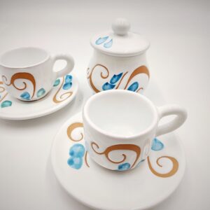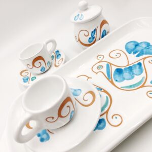 Servizio tet a tet caffè in ceramica decorata a mano, la decorazione riproduce nel vassoio una coppia di pavoncelle tradizionali realizzate con l’antica tecnica del graffito su smalto bianco che mette in risalto le sfumature aranciate dell’argilla. L’azzurro del mare è ottenuto aggiungendo al graffito tocchi di colore con il pennello.