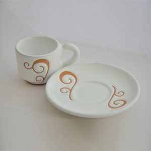 Tazzina da caffè in ceramica decorata a mano, la decorazione riproduce il ricciolo della pavoncella realizzata con l’antica tecnica del graffito su smalto bianco che mette in risalto le sfumature aranciate dell’argilla.