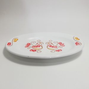 Vassoio ovale da tavola liscio in ceramica decorata a mano, la decorazione riproduce una coppia di pavoncelle tradizionali realizzate con l’antica tecnica del graffito su smalto bianco che mette in risalto le sfumature aranciate dell’argilla. I rossi corallo sono ottenuti aggiungendo al graffito tocchi di colore con il pennello. L’oggetto fa parte della linea Pavoncella e si presta sia per uso decorativo, sia per uso alimentare.