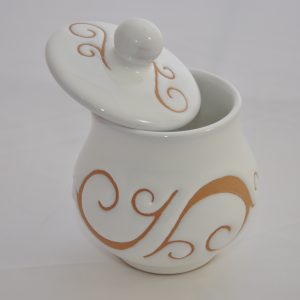 Zuccheriera in ceramica decorata a mano, la decorazione riproduce il ricciolo della pavoncella realizzata con l’antica tecnica del graffito su smalto bianco che mette in risalto le sfumature aranciate dell’argilla.