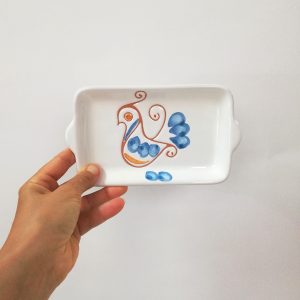 28,00€Vassoio rettangolare in ceramica decorata a mano, caratterizzata dalla decorazione riproduce una coppia di pavoncelle tradizionali realizzate con l’antica tecnica del graffito su smalto bianco che mette in risalto le sfumature aranciate dell’argilla arricchito dai tocchi delle pennellate di colore rosso corallo.