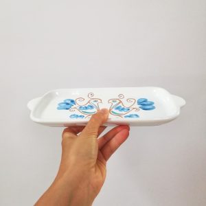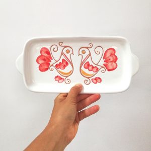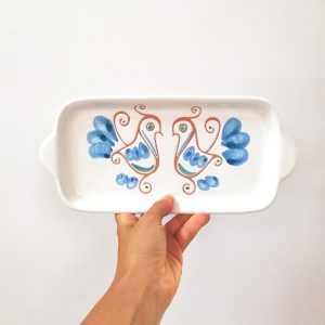 28,00€Vassoio rettangolare in ceramica decorata a mano, caratterizzata dalla decorazione riproduce una coppia di pavoncelle tradizionali realizzate con l’antica tecnica del graffito su smalto bianco che mette in risalto le sfumature aranciate dell’argilla arricchito dai tocchi delle pennellate di colore rosso corallo.