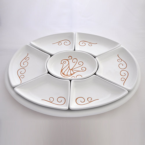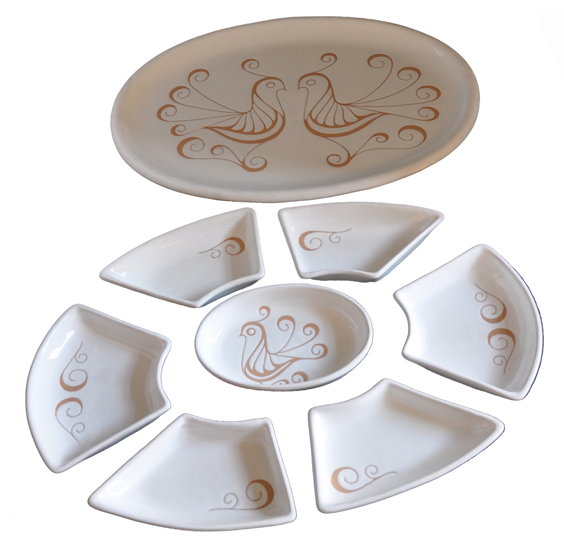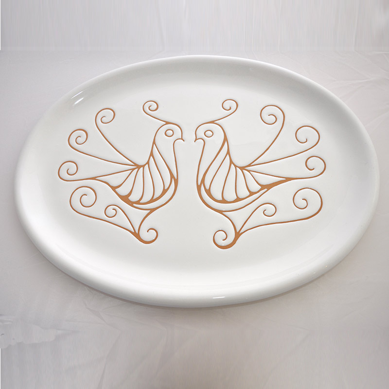 Antipastiera ovale in ceramica decorata a mano, la decorazione del piatto riproduce le pavoncelle tradizionali realizzate con l’antica tecnica del graffito su smalto bianco che mette in risalto le sfumature aranciate dell’argilla. Composta da 8 pezzi.