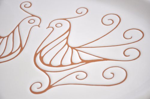 - La terza fase consiste nel togliere il pezzo dal forno che si sarà trasformato da semplice argilla in “biscotto” con una colorazione rossiccia. A questo punto il pezzo viene smaltato di bianco e lasciato asciugare per poi poter essere inciso e colorato.
