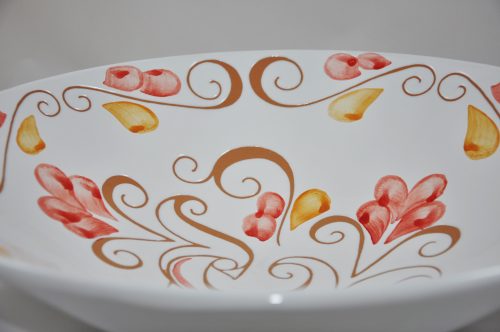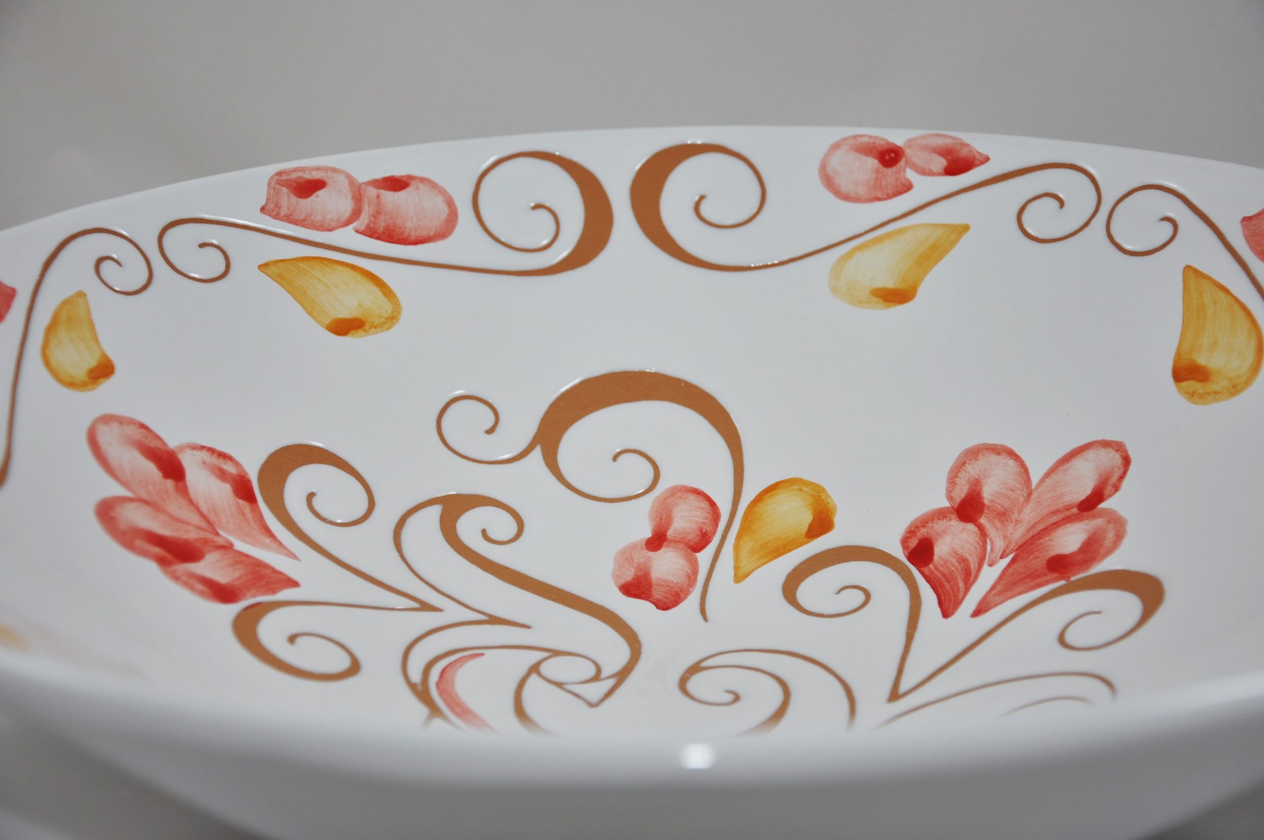 Ciotola Coppa in ceramica decorata a mano,caratterizzata dalla decorazione che riproduce una pavoncella stilizzata, realizzata con l’antica tecnica del graffito su smalto bianco che mette in risalto le sfumature aranciate dell’argilla. Il rosso corallo e gli aranci brillanti sono ottenuti aggiungendo al graffito tocchi di pennello.