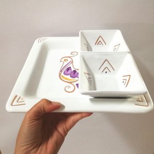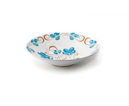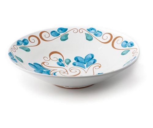 Ciotola, in ceramica realizzata a mano al tornio, caratterizzata dalla decorazione che riproduce le pavoncelle stilizzate, decorata con l’antica tecnica del graffito su smalto bianco che mette in risalto le sfumature aranciate dell’argilla arricchito dai tocchi delle pennellate azzurro e verde . La finezza ed eleganza della lavorazione e l’utilizzo di materiali atossici rendono l’oggetto particolarmente indicato per un uso alimentare, oltre che decorativo. Trattandosi di produzione artigianale, il prodotto finale potrebbe differire leggermente dalla foto.