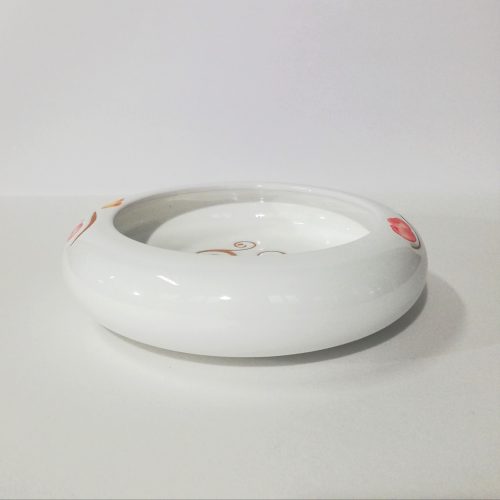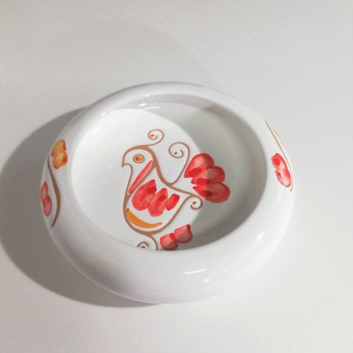 Ciotola Vuota tasche, in ceramica decorato a mano, la decorazione riproduce la pavoncella tradizionale realizzata con l’antica tecnica del graffito su smalto bianco che mette in risalto le sfumature aranciate dell’argilla arrichito dai tocchi delle pennellate di colore rosso corallo . La finezza ed eleganza della lavorazione e l’utilizzo di materiali atossici rendono l’oggetto particolarmente indicato per un uso alimentare, oltre che decorativo.