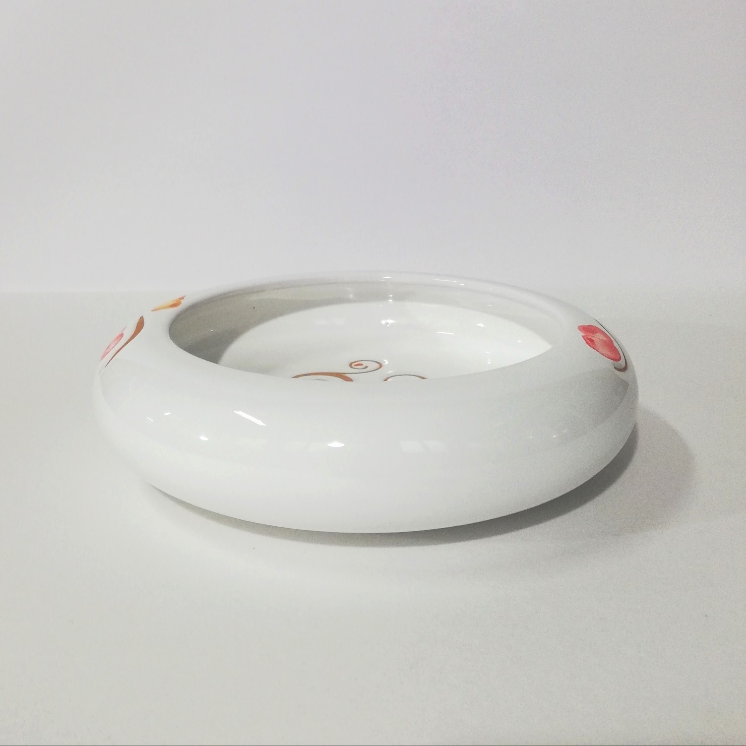 Ceramica smaltata bianco lucido,decorata con le tonalita del rosso e incisa con la tecnica del graffitto.