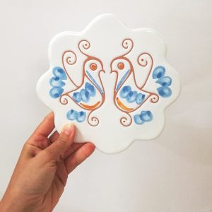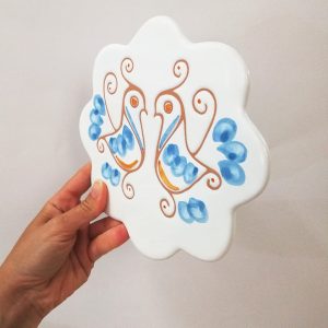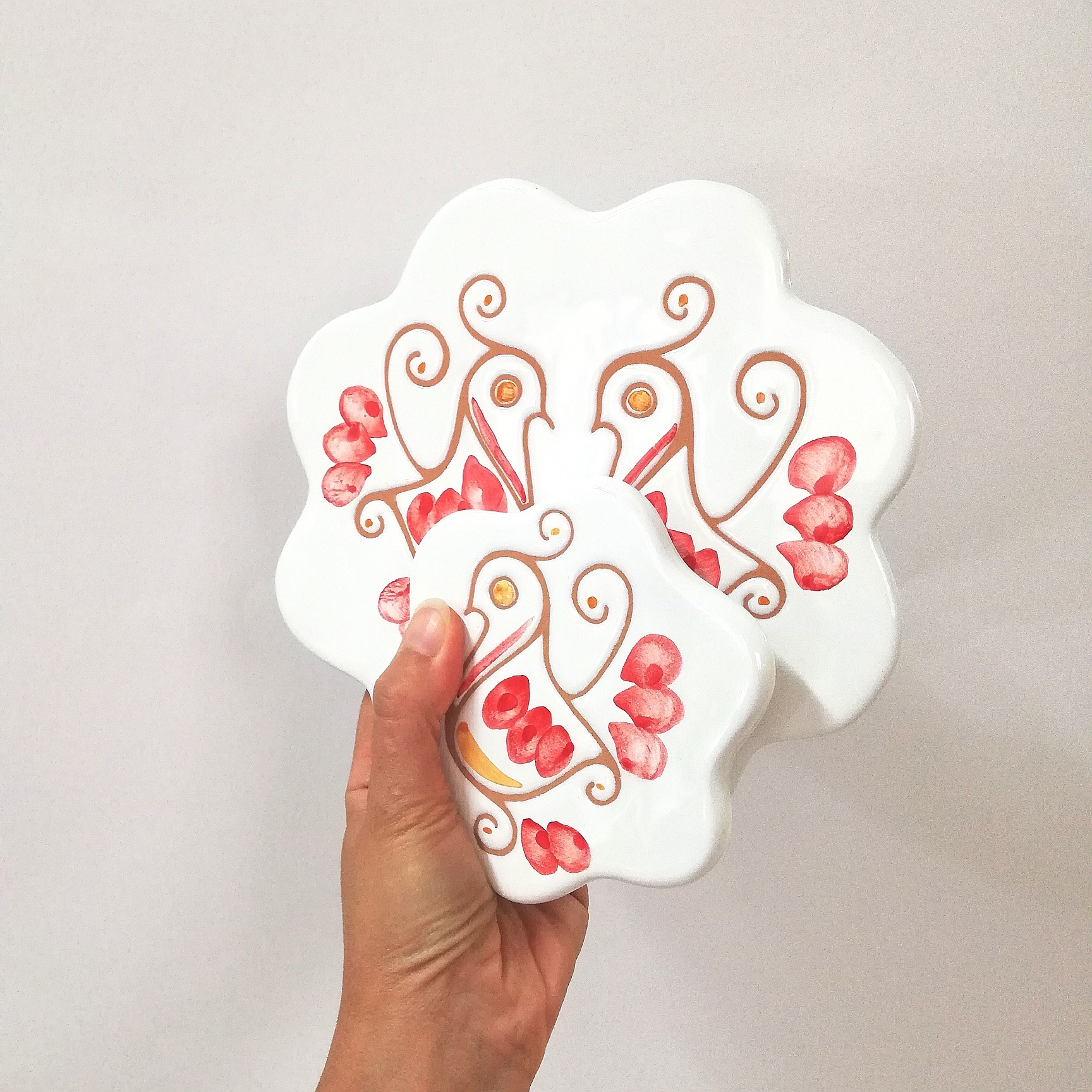 Coppia Sottopentola/Sottomoka Margherita in ceramica decorato a mano, la decorazione riproduce una pavoncella tradizionale realizzata con l’antica tecnica del graffito su smalto bianco che mette in risalto le sfumature aranciate dell’argilla, arricchita dalle pennellate di colore rosso corallo.