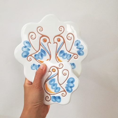 - La terza fase consiste nel togliere il pezzo dal forno che si sarà trasformato da semplice argilla in “biscotto” con una colorazione rossiccia. A questo punto il pezzo viene smaltato di bianco e lasciato asciugare per poi poter essere inciso e colorato.