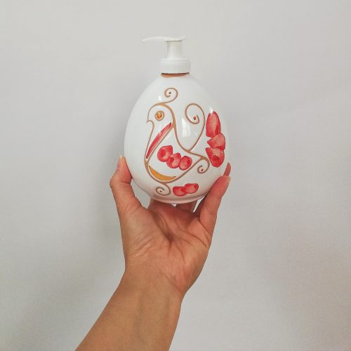 Portasapone liquido in ceramica decorato a mano, la decorazione riproduce una pavoncella tradizionale realizzato con l’antica tecnica del graffito su smalto bianco che mette in risalto le sfumature aranciate dell’argilla arricchito dai tocchi delle pennellate di colore rosso corallo.