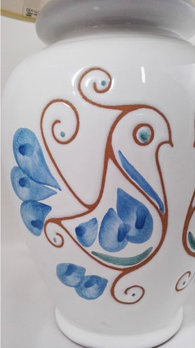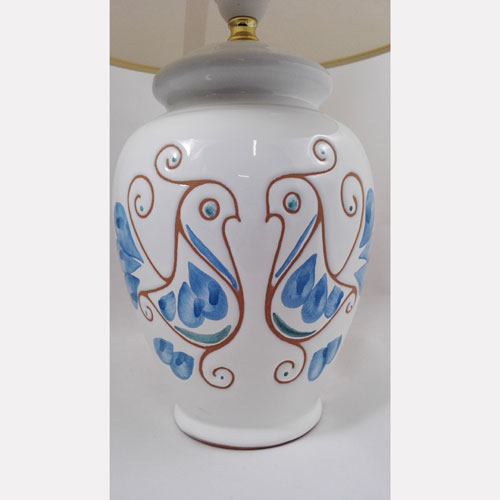 Lampada da tavolo conica in ceramica decorata a mano, la decorazione riproduce le pavoncelle tradizionali realizzate con l’antica tecnica del graffito su smalto bianco che mette in risalto le sfumature aranciate dell’argilla arrichito dai tocchi delle pennellate di colore azzurro oltremare e verde brillante .