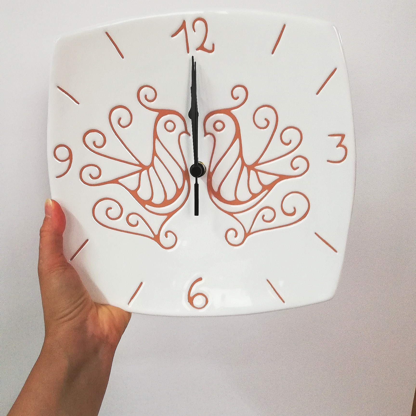 Orologio a muro in ceramica decorata a mano 25 x 25 cm, caratterizzata dalla decorazione che riproduce una coppia di pavoncelle tradizionali, realizzate con l’antica tecnica del graffito su smalto bianco che mette in risalto le sfumature aranciate dell’argilla.