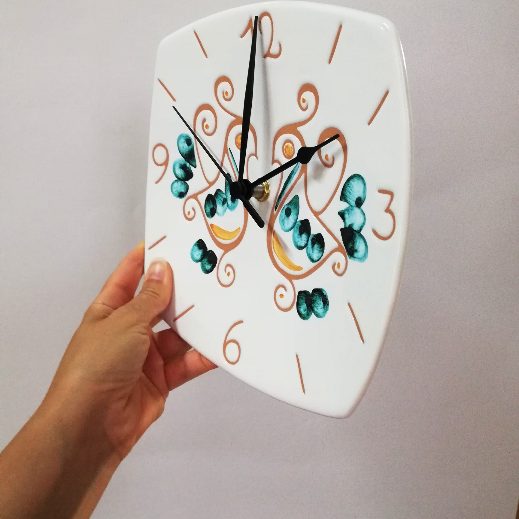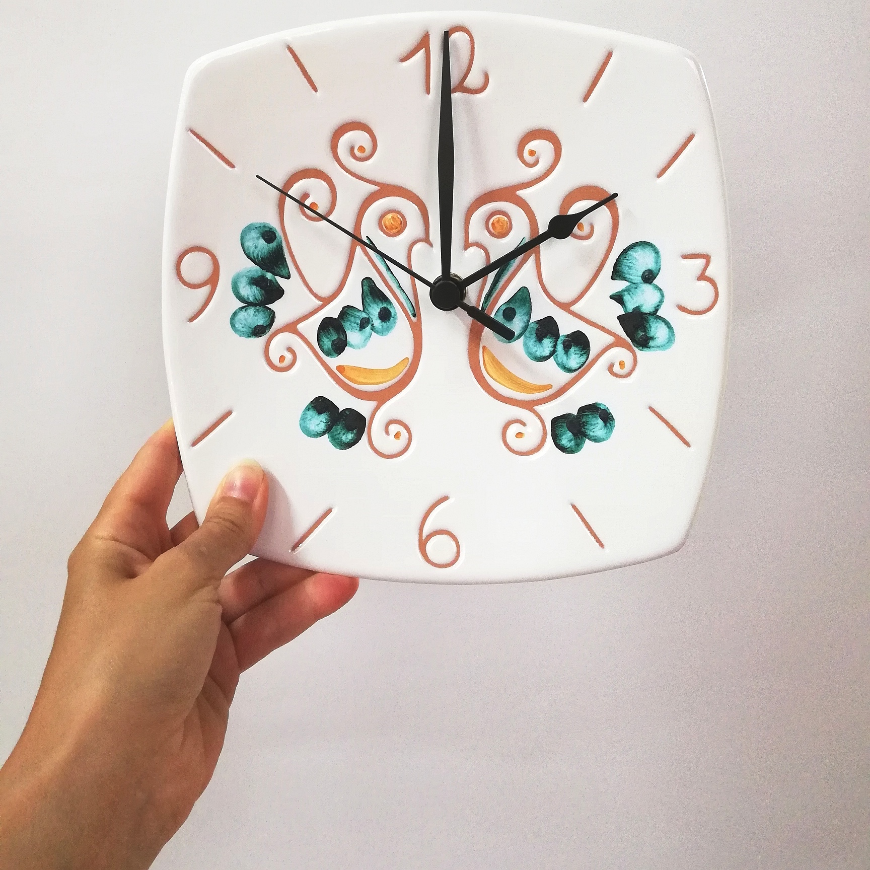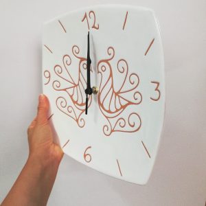 Orologio a muro in ceramica decorata a mano 20 x 20 cm, caratterizzata dalla decorazione che riproduce una coppia di pavoncelle tradizionali, realizzate con l’antica tecnica del graffito su smalto bianco che mette in risalto le sfumature aranciate dell’argilla.Il verde smeraldo è ottenuto aggiungendo al graffito tocchi di pennello.