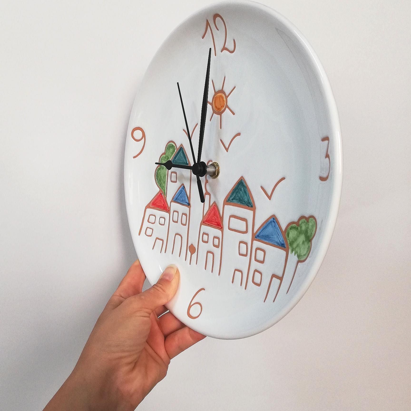 Orologio Tondo decorato a mano, la decorazione riproduce un piccolo paesaggio realizzato con l’antica tecnica del graffito su smalto bianco che mette in risalto le sfumature aranciate dell’argilla arrichito dai tocchi delle pennellate.
