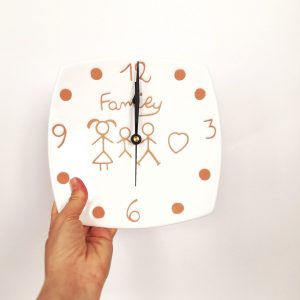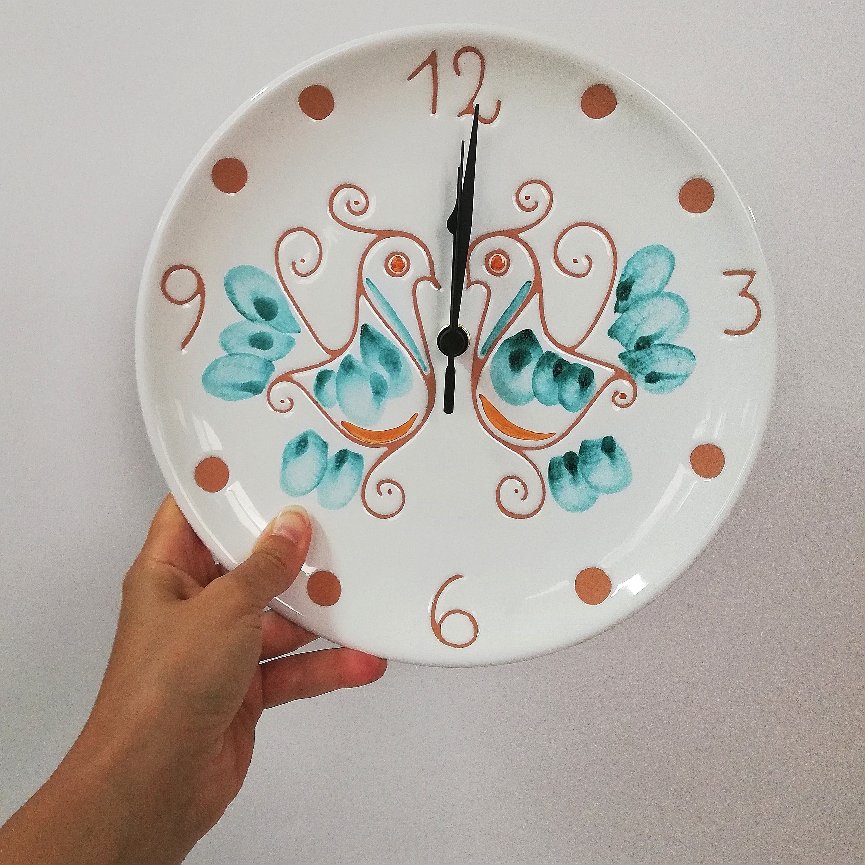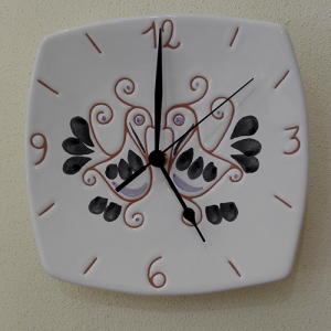 Orologio Tondo decorato a mano, la decorazione riproduce una coppia di pavoncelle tradizionali realizzate con l’antica tecnica del graffito su smalto bianco che mette in risalto le sfumature aranciate dell’argilla arrichito dai tocchi delle pennellate verde smeraldo.