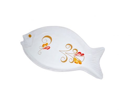 Piatto a forma di pesce in ceramica decorato a mano, la decorazione riproduce una coppia di pavoncelle tradizionali realizzate con l’antica tecnica del graffito su smalto bianco che mette in risalto le sfumature aranciate dell’argilla arrichito dai tocchi delle pennellate di colore rosso corallo . La finezza ed eleganza della lavorazione e l’utilizzo di materiali atossici rendono l’oggetto particolarmente indicato per un uso alimentare, oltre che decorativo.
