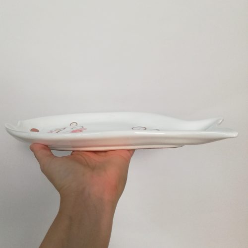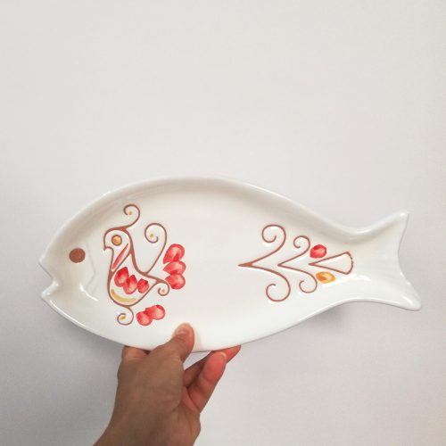 Piatto a forma di pesce in ceramica decorato a mano, la decorazione riproduce una pavoncella tradizionale realizzata con l’antica tecnica del graffito su smalto bianco che mette in risalto le sfumature aranciate dell’argilla arrichito dai tocchi delle pennellate di colore rosso corallo . La finezza ed eleganza della lavorazione e l’utilizzo di materiali atossici rendono l’oggetto particolarmente indicato per un uso alimentare, oltre che decorativo.