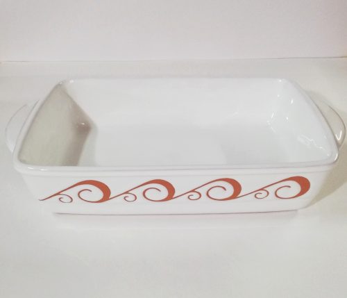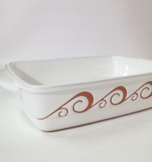 Pirofila da forno smaltata bianca con incisi ai lati i riccioli della pavoncella.