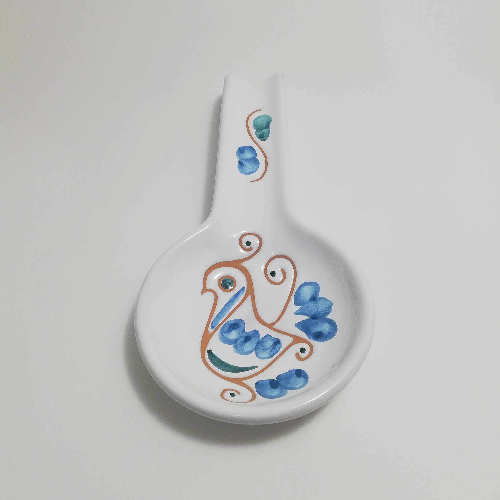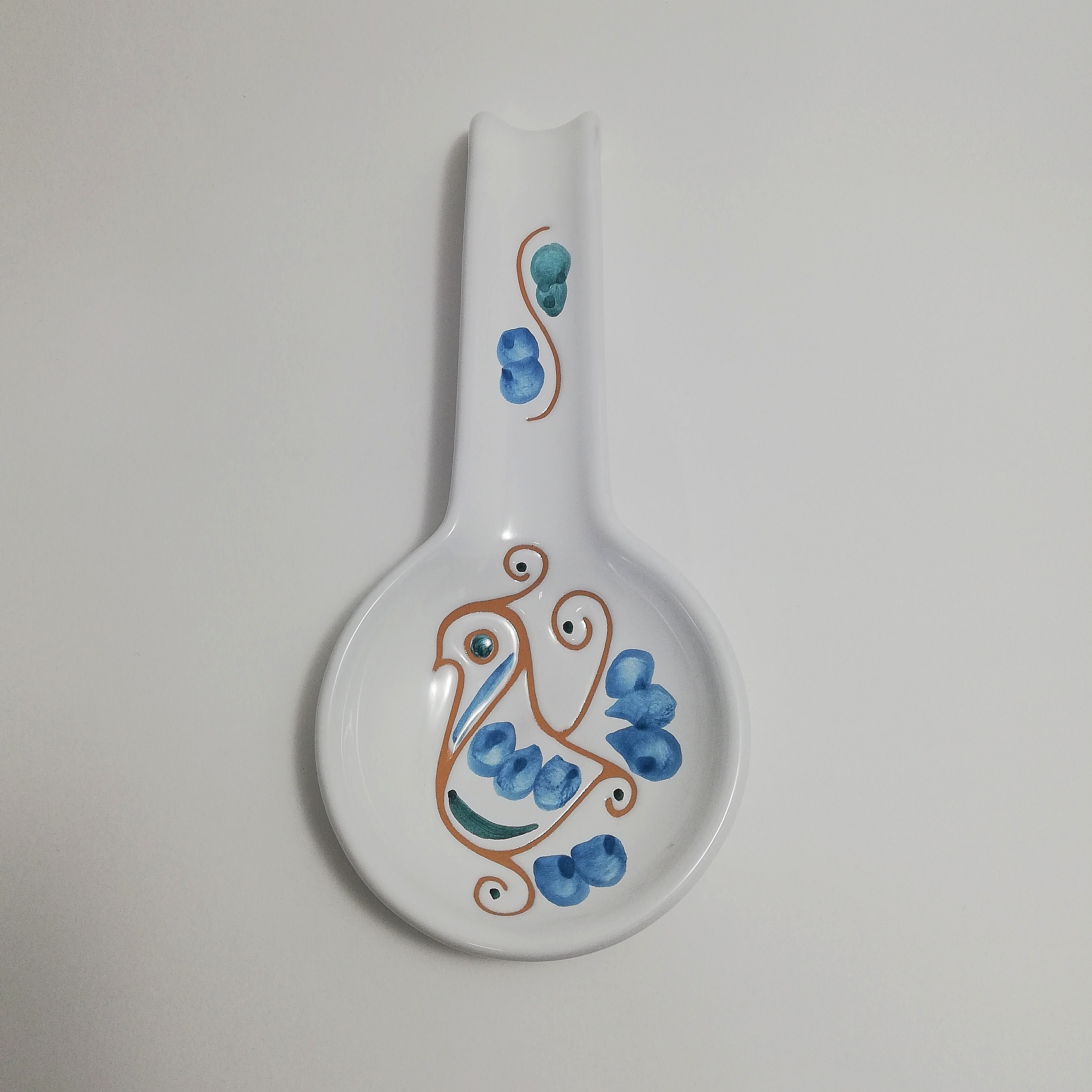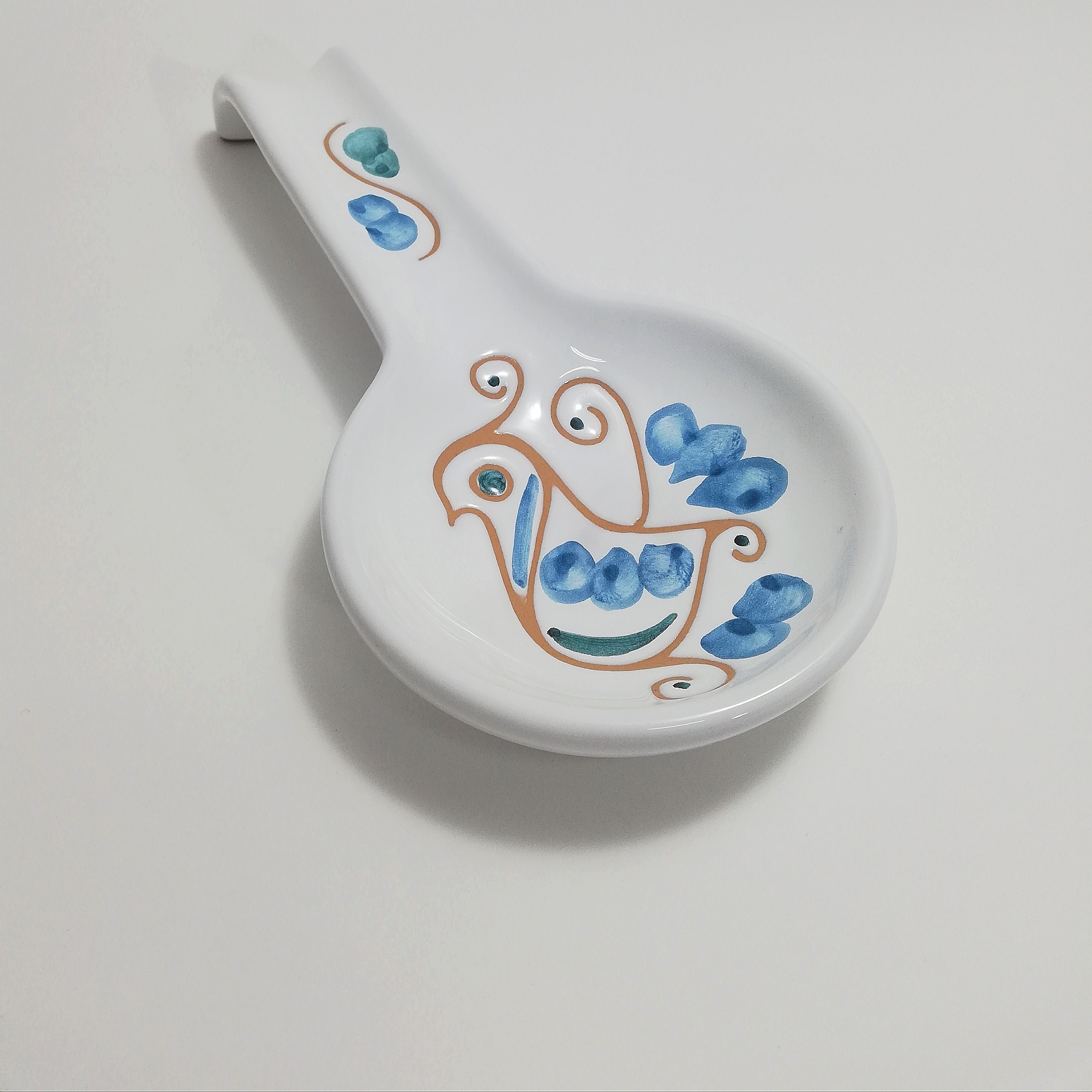 Poggiamestolo in ceramica decorato a mano, la decorazione riproduce una pavoncella tradizionale realizzata con l’antica tecnica del graffito su smalto bianco che mette in risalto le sfumature aranciate dell’argilla arrichito dai tocchi delle pennellate dell’azzurro oltremare e verde brillante .