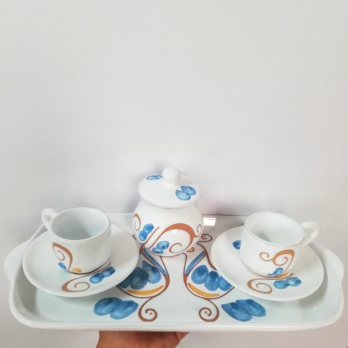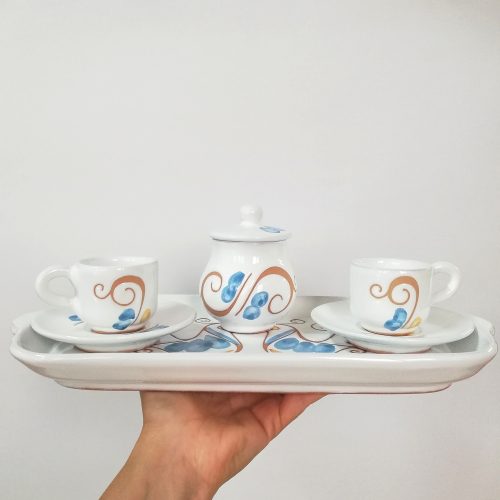 Servizio tet a tet caffè in ceramica decorata a mano, la decorazione riproduce nel vassoio una coppia di pavoncelle tradizionali realizzate con l’antica tecnica del graffito su smalto bianco che mette in risalto le sfumature aranciate dell’argilla. L’azzurro del mare è ottenuto aggiungendo al graffito tocchi di colore con il pennello.