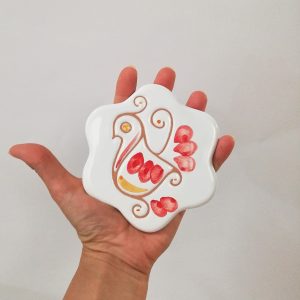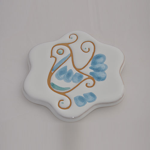 Sottopentola/Sottobicchiere Margherita in ceramica decorato a mano, la decorazione riproduce una pavoncella tradizionale realizzata con l’antica tecnica del graffito su smalto bianco che mette in risalto le sfumature aranciate dell’argilla arrichito dai tocchi delle pennellate di colore azzurro e verde oltremare.