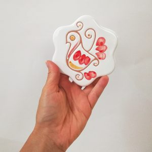 - La terza fase consiste nel togliere il pezzo dal forno che si sarà trasformato da semplice argilla in “biscotto” con una colorazione rossiccia. A questo punto il pezzo viene smaltato di bianco e lasciato asciugare per poi poter essere inciso e colorato.