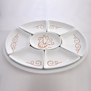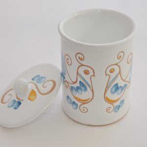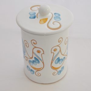 Gli azzurri oltremare sono ottenuti aggiungendo al graffito tocchi di colore con il pennello. L’oggetto fa parte della linea Pavoncella e si presta sia per uso decorativo, sia per uso alimentare.