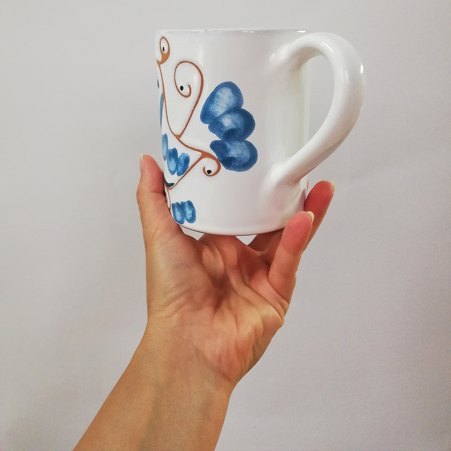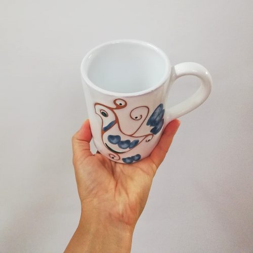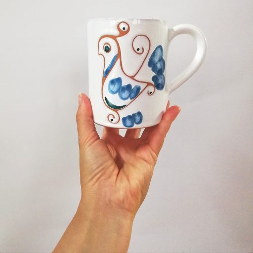 Tazza Mug in ceramica decorata a mano, la decorazione riproduce una pavoncella tradizionali realizzata con l’antica tecnica del graffito su smalto bianco che mette in risalto le sfumature aranciate dell’argilla.