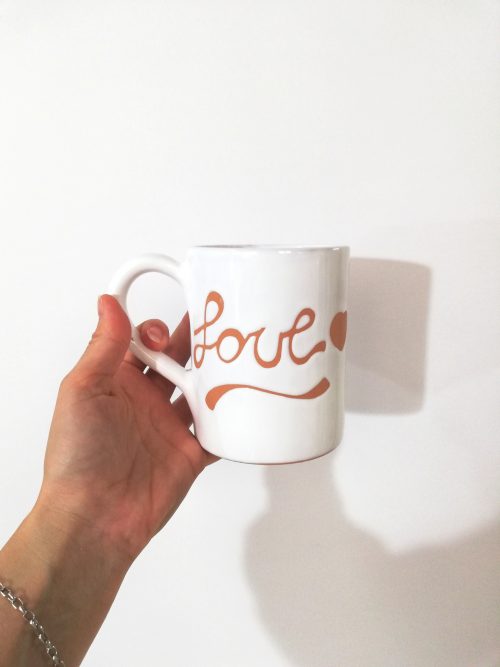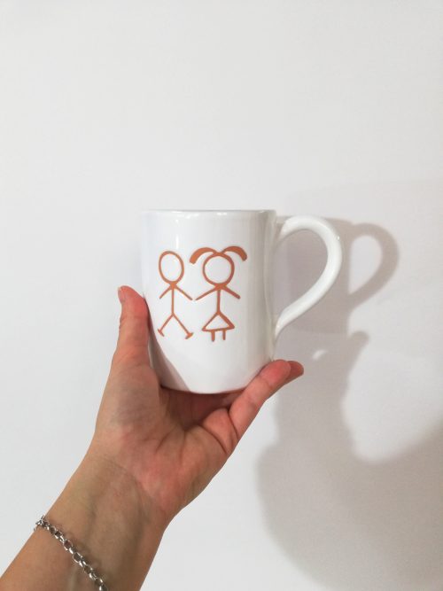 Tazza Mug in ceramica decorata a mano,personalizzata. La decorazione riproduce una coppia stilizzata realizzata con l’antica tecnica del graffito su smalto bianco che mette in risalto le sfumature aranciate dell’argilla e il nome scelto.