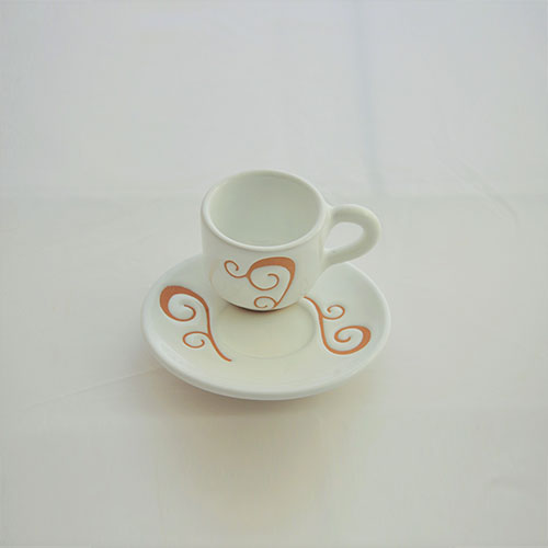 Tazzina da caffè in ceramica decorata a mano, la decorazione riproduce il ricciolo della pavoncella realizzata con l’antica tecnica del graffito su smalto bianco che mette in risalto le sfumature aranciate dell’argilla.
