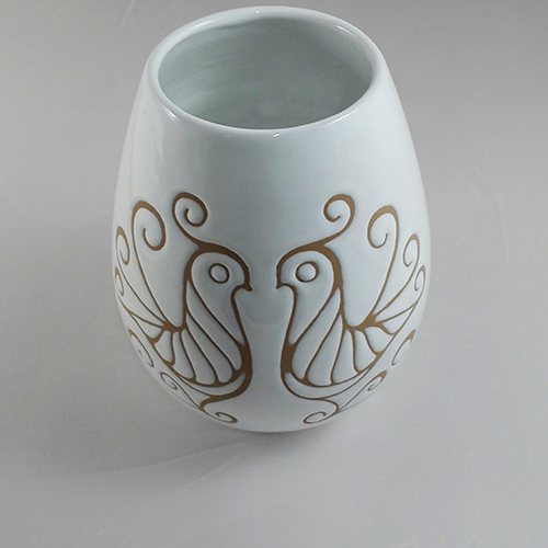 - La terza fase consiste nel togliere il pezzo dal forno che si sarà trasformato da semplice argilla in “biscotto” con una colorazione rossiccia. A questo punto il pezzo viene smaltato di bianco e lasciato asciugare per poi poter essere inciso e colorato.