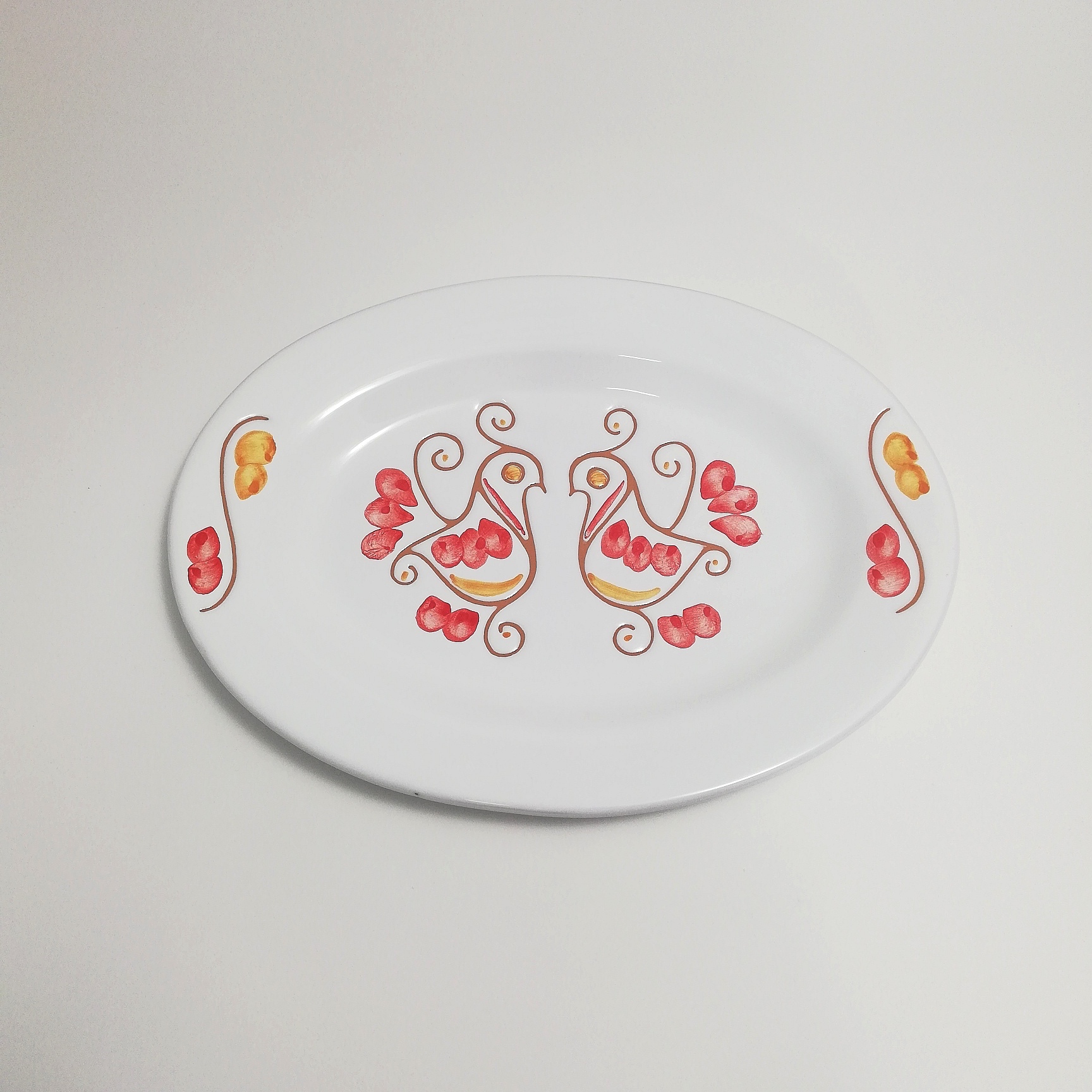 Vassoio ovale da tavola liscio in ceramica decorata a mano, la decorazione riproduce una coppia di pavoncelle tradizionali realizzate con l’antica tecnica del graffito su smalto bianco che mette in risalto le sfumature aranciate dell’argilla. I rossi corallo sono ottenuti aggiungendo al graffito tocchi di colore con il pennello. L’oggetto fa parte della linea Pavoncella e si presta sia per uso decorativo, sia per uso alimentare.