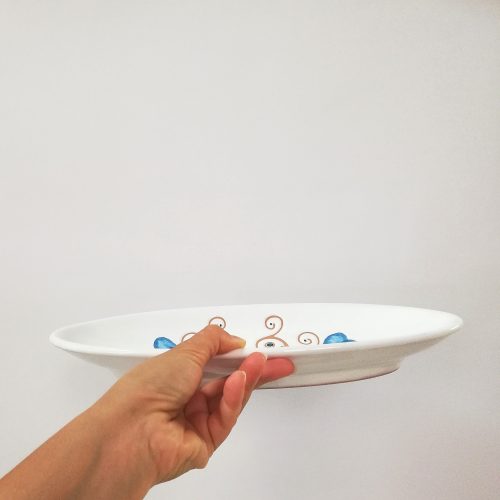 Vassoio ovale pesce in ceramica decorata a mano, la decorazione riproduce una coppia di pavoncelle tradizionali realizzate con l’antica tecnica del graffito su smalto bianco che mette in risalto le sfumature aranciate dell’argilla. L’azzurro e il verde brillante risaltano sullo smalto bianco.