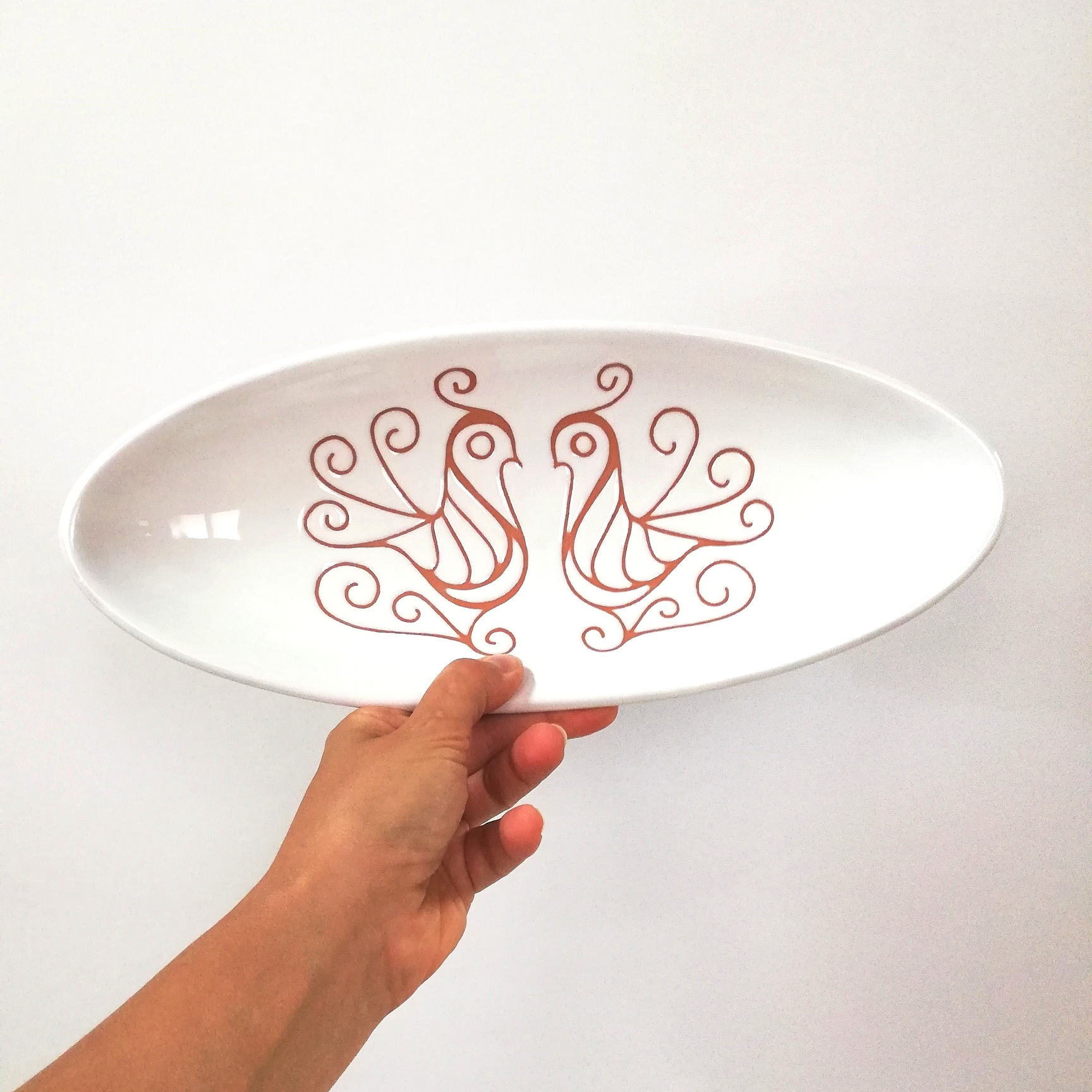 Vassoio ovale pesce in ceramica decorata a mano, la decorazione riproduce una coppia di pavoncelle tradizionali realizzate con l’antica tecnica del graffito su smalto bianco che mette in risalto le sfumature aranciate dell’argilla.