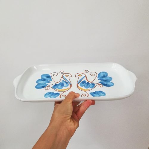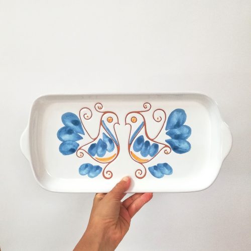 Vassoio rettangolare in ceramica decorata a mano, caratterizzata dalla decorazione riproduce una coppia di pavoncelle tradizionali realizzate con l’antica tecnica del graffito su smalto bianco che mette in risalto le sfumature aranciate dell’argilla arricchito dai tocchi delle pennellate di colore azzurro oltremare .