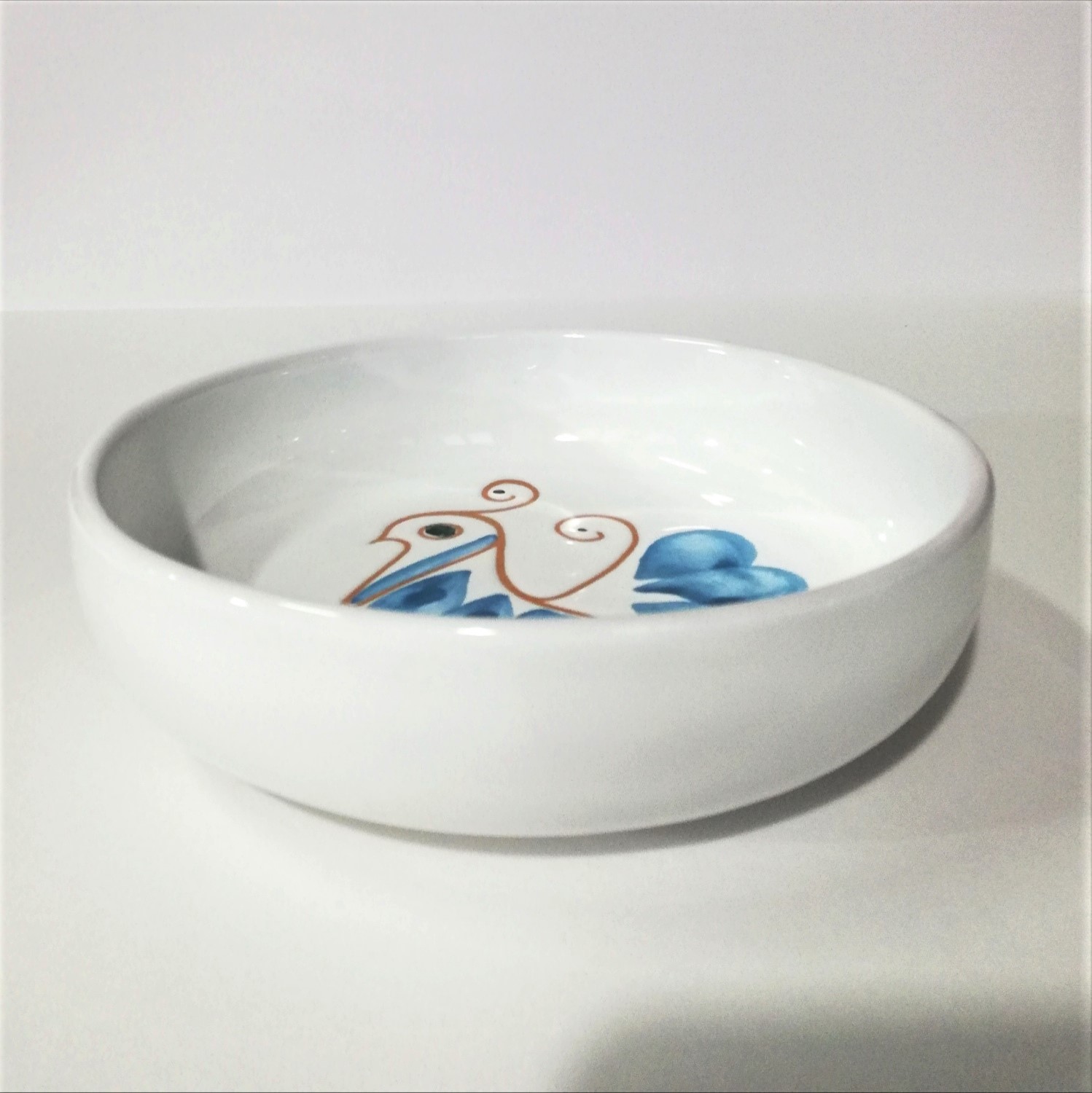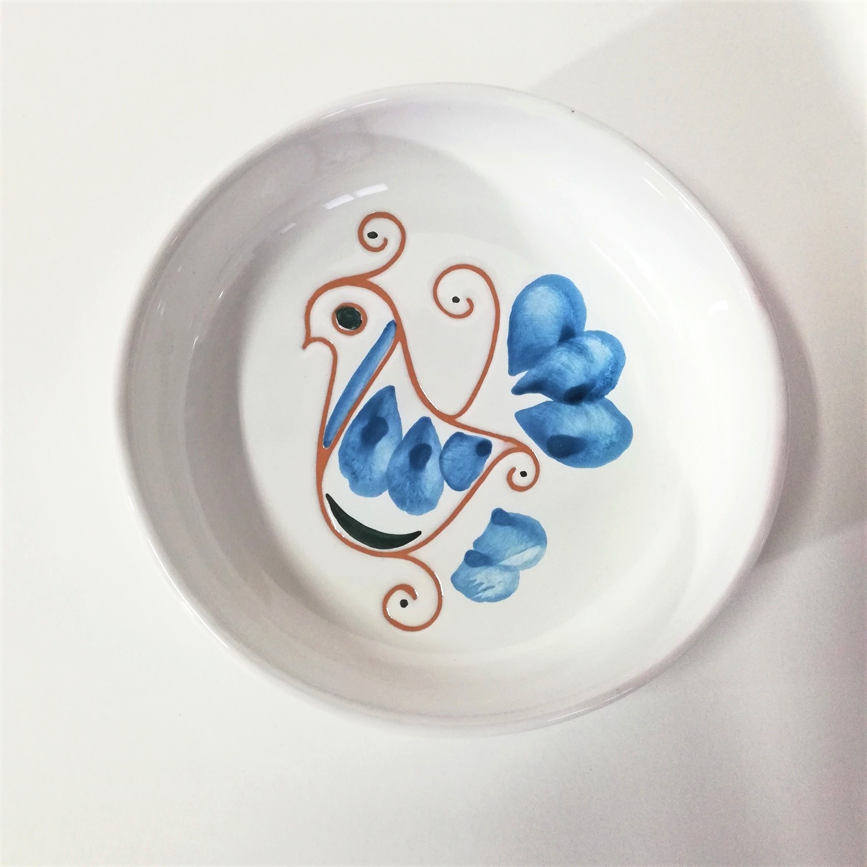 Ciotola Vuota tasche, in ceramica decorato a mano, la decorazione riproduce la pavoncella tradizionale realizzata con l’antica tecnica del graffito su smalto bianco che mette in risalto le sfumature aranciate dell’argilla arrichito dai tocchi delle pennellate di colore.