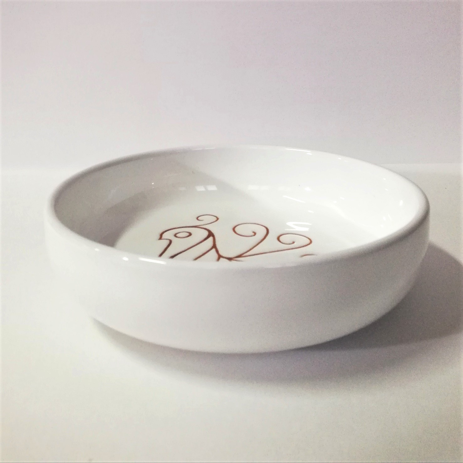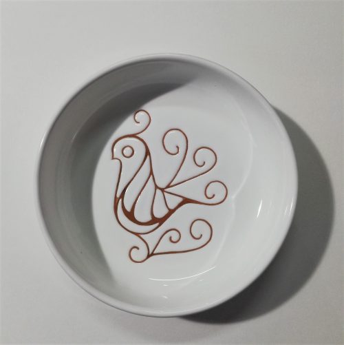 Ciotola Vuota tasche, in ceramica decorato a mano, la decorazione riproduce la pavoncella  tradizionale realizzata con l’antica tecnica del graffito su smalto bianco che mette in risalto le sfumature aranciate dell’argilla arrichito dai tocchi delle pennellate di colore.