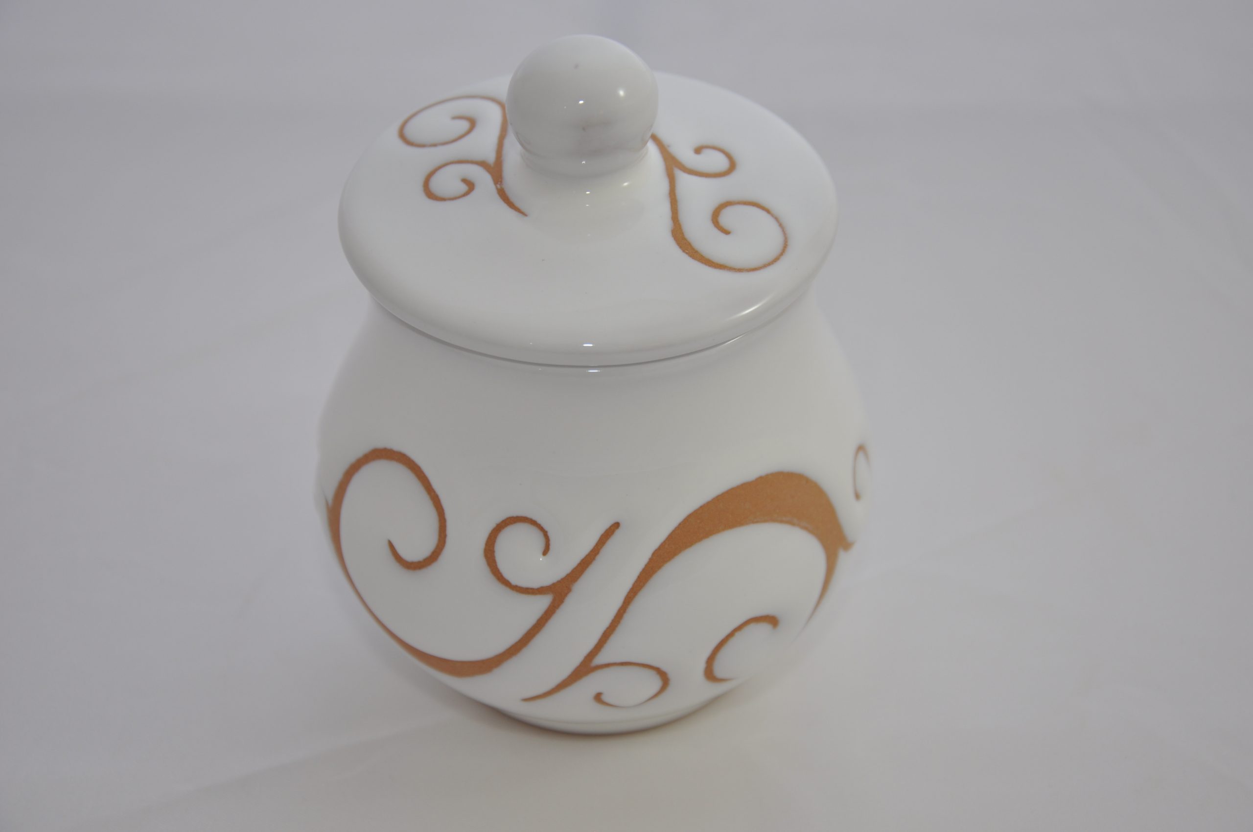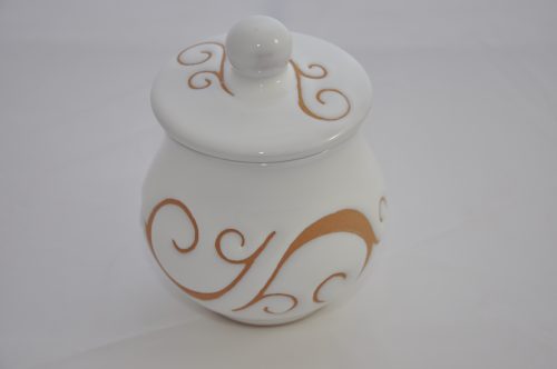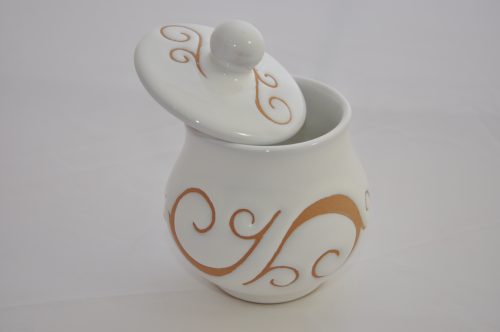 Zuccheriera in ceramica decorata a mano, la decorazione riproduce il ricciolo della pavoncella realizzata con l’antica tecnica del graffito su smalto bianco che mette in risalto le sfumature aranciate dell’argilla.